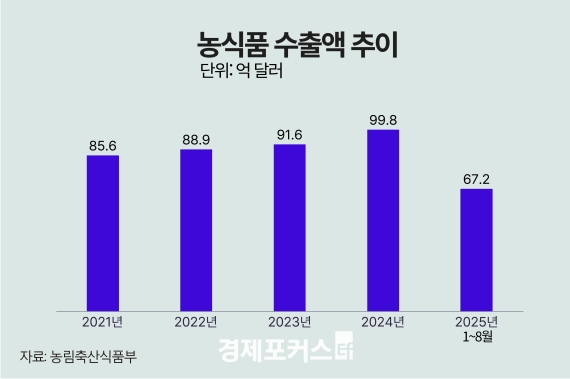 22ÀÏ ³ó¸²Ãà»ê½ÄǰºÎ¿¡ µû¸£¸é ¿ÃÇØ 1¿ùºÎÅÍ 8¿ù±îÁö Áý°èµÈ ³ó½Äǰ ´©Àû ¼öÃâ¾×Àº 67¾ï1500¸¸ ´Þ·¯(¾à 9Á¶4000¾ï¿ø)·Î, Áö³ÇØ °°Àº ±â°£º¸´Ù 5.1% ´Ã¸ç ¿ª´ë ÃÖ°íÄ¡¸¦ °æ½ÅÇß´Ù. ÀÌ Ãß¼¼°¡ À̾îÁö¸é ¿ÃÇØ ¸ñǥġÀÎ 105¾ï ´Þ·¯(¾à 14Á¶5000¾ï¿ø) ´Þ¼ºÀÌ °¡´ÉÇÒ °ÍÀ¸·Î Àü¸ÁµÈ´Ù.