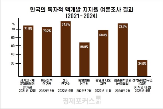 ÇÑÆí SK±×·ì ½ÌÅ© ÅÊÅ©ÀÎ ÃÖÁ¾Çö Çмú¿øÀÌ Áö³ 2¿ù 5ÀÏ Çѱ¹ °¶·´¿¡ ÀÇ·ÚÇØ ½Ç½ÃÇÑ 2Â÷ ¿©·ÐÁ¶»ç °á°ú(ÀÀ´äÀÚ 1,043¸í)¿¡ µû¸£¸é, Çѱ¹ÀÇ µ¶ÀÚÀûÀÎ ÇÙ °³¹ßÀÌ ÇÊ¿äÇÏ´Ù´Â ÀÀ´ä·üÀº 72.8%·Î Áö³ÇØÀÇ 76.6%¿¡ ºñÇØ ¼ÒÆø °¨¼ÒÇßÁö¸¸, ¿©ÀüÈ÷ ³ôÀº ¼öÁØÀÌ´Ù. ¹Ì±¹ ¿ö½ÌÅÏÀÇ ½ÌÅ© ÅÊÅ©ÀÎ Àü·«¹®Á¦¿¬±¸¼Ò(CSIS)´Â Áö³ 4¿ù 29ÀÏ ¹ßÇ¥ÇÑ ¼³¹® Á¶»ç°á°ú¿¡ µû¸£¸é, Çѱ¹ Áö½ÄÀÎÀÇ 34%¸¸ÀÌ µ¶ÀÚÀûÀÎ ÇÙ¹«Àå¿¡ Âù¼ºÇÑ´Ù°í Çϸ鼵µ ¹Ì±¹ÀÇ ´ë¿Ü Á¤Ã¥ º¯È¿¡ µû¶ó ÇÙ¹«Àå¿¡ Âù¼ºÇÏ´Â Çѱ¹ Áö½ÄÀÎÀÇ ¼ö´Â ´Ã¾î³¯ ¼ö ÀÖ´Ù°í ¹ßÇ¥Çß´Ù.