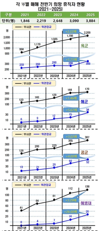 ±¹¹ÎÀÇÈû À¯¿ë¿ø ÀÇ¿ø½ÇÀÌ 28ÀÏ ±¹¹æºÎ¿¡¼ Á¦Ãâ¹ÞÀº ‘ÃÖ±Ù 5³â ¸ÅÇØ Àü¹Ý±â ÏÚ °£ºÎÀÇ Èñ¸Á Àü¿ª ÇöȲÀÚ·á’¿¡ ÀÇÇϸé, ÃÊ·Áß±Þ°£ºÎ(ºÎ»ç°ü, À§·¿µ°ü Àå±³)µéÀÌ Á¤³â¿¡ µµ´ÞÇϱâ ÀÌÀü(ì¤îñ) Àü¿ªÀ» ½ÅûÇÑ ¼ýÀÚ´Â 2021³â Àü¹Ý±â¿£ 1351¸íÀ̾úÀ¸³ª, ¿ÃÇØ Àü¹Ý±â´Â 2869¸íÀ¸·Î ¾à 2.1¹è°¡ ´Ã¾ú´Ù. À̶§ Èñ¸ÁÀü¿ªÀÚÀÇ 86%(2460¸í)°¡ Ãʱް£ºÎ(ºÎ»ç°ü·À§°üÀå±³)µéÀÌ´Ù.