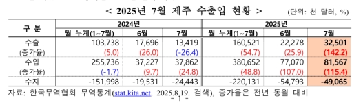 19ÀÏ Çѱ¹¹«¿ªÇùȸ Á¦ÁÖÁöºÎ°¡ ¹ßÇ¥ÇÑ ‘2025³â 7¿ù Á¦ÁÖ ¼öÃâÀÔ µ¿Çâ’¿¡ µû¸£¸é, Áö³´Þ Á¦ÁÖ ¼öÃâÀº Àü³â µ¿¿ù ´ëºñ 142.2% Áõ°¡ÇÑ 3250¸¸ ´Þ·¯·Î Àü±¹ 17°³ ½Ã·µµ °¡¿îµ¥ °¡Àå ³ôÀº Áõ°¡À²À» º¸¿´´Ù. ¹Ý¸é ¼öÀÔÀº 115.4% ´Ã¾î³ 8157¸¸ ´Þ·¯·Î Áý°èµÇ¸é¼, ¹«¿ª¼öÁö´Â 4906¸¸ ´Þ·¯ ÀûÀÚ¸¦ ±â·ÏÇß´Ù. ¼öÃâ Áõ°¡À²Àº Àü±¹ 17°³ ½Ã·µµ °¡¿îµ¥ °¡Àå ³ô¾ÒÀ¸¸ç, Àü±¹ Æò±Õ ¼öÃâ Áõ°¡À²Àº 5.8%¿´´Ù.
