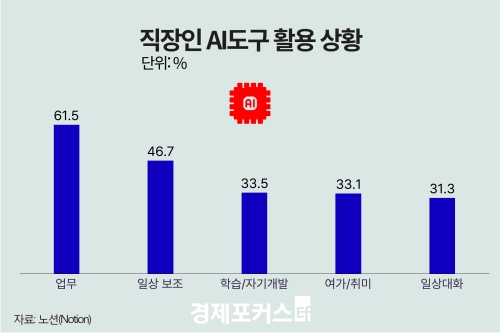 2ÀÏ ±Û·Î¹ú AI ±â¹Ý Çù¾÷ Åø ³ë¼Ç(Notion)ÀÌ ¹ßÇ¥ÇÑ ‘Çѱ¹ Á÷ÀåÀÎ AI »ç¿ë µ¿Çâ’¿¡ µû¸£¸é AI »ç¿ë °æÇèÀÌ ÀÖ´Â Á÷ÀåÀÎ ¹× ÇÁ¸®·£¼ 480¸í Áß 61.5%°¡ ¾÷¹«¿¡ AI µµ±¸¸¦ Ȱ¿ëÇϰí ÀÖ´Ù°í ´äÇß´Ù. ÀÌ´Â ÀÏ»ó º¸Á¶(46.7%), ÇнÀ·ÀÚ±â°è¹ß(33.5%), ¿©°¡·Ãë¹Ì(33.1%) µî ´Ù¸¥ Ȱ¿ë ºÐ¾ßº¸´Ù ³ôÀº ºñÁßÀÌ´Ù.
