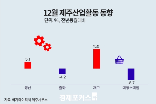 ±¹°¡µ¥ÀÌÅÍó Á¦Áֻ繫¼Ò°¡ Áö³´Þ 30ÀÏ ¹ßÇ¥ÇÑ ‘2025³â 12¿ù Á¦ÁÖ »ê¾÷Ȱµ¿µ¿Çâ’¿¡ µû¸£¸é, 12¿ù Á¦ÁÖÁö¿ª ±¤°ø¾÷ »ý»êÁö¼ö´Â 116.4·Î Àü³â µ¿¿ù ´ëºñ 5.1% Áõ°¡Çß´Ù. ´Ù¸¸ Àü¿ù ´ëºñ·Î´Â 1.7% °¨¼ÒÇß´Ù.