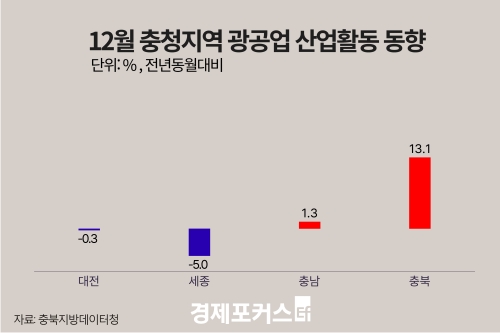 30ÀÏ ±¹°¡µ¥ÀÌÅÍó ÃæºÏÁö¹æµ¥ÀÌÅÍûÀÌ ¹ßÇ¥ÇÑ ‘2025³â 12¿ù ÃæÃ»Áö¿ª »ê¾÷Ȱµ¿µ¿Çâ’¿¡ µû¸£¸é ÃæºÏÀÇ ±¤°ø¾÷ »ý»êÀº Àü¿ù ´ëºñ 14.7%, Àü³â µ¿¿ù ´ëºñ 13.1% °¢°¢ Áõ°¡ÇØ Àü±¹ Æò±Õ(-0.3%)À» Å©°Ô ¿ôµ¹¾Ò´Ù. Ãæ³²µµ Àü¿ù ´ëºñ 1.3%, Àü³â µ¿¿ù ´ëºñ 1.3% °¢°¢ Áõ°¡Çß´Ù. ¹Ý¸é ´ëÀüÀº Àü¿ù ´ëºñ 1.9% Áõ°¡ÇßÀ¸³ª Àü³â µ¿¿ù ´ëºñ 0.3% °¨¼ÒÇß°í, ¼¼Á¾Àº Àü¿ù ´ëºñ 3.0% Áõ°¡ÇßÀ¸³ª Àü³â µ¿¿ù ´ëºñ 5.0% °¨¼ÒÇß´Ù.