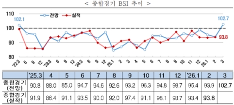 24ÀÏ Çѱ¹°æÁ¦ÀÎÇùȸ(ÇѰæÇù)¿¡ µû¸£¸é ¸ÅÃâ¾× ±âÁØ 600´ë ±â¾÷À» ´ë»óÀ¸·Î Á¶»çÇÑ 3¿ù ±â¾÷°æ±â½Ç»çÁö¼ö(BSI) Àü¸ÁÄ¡´Â 102.7·Î Áý°èµÆ´Ù. BSI°¡ ±âÁؼ± 100À» ³ÑÀ¸¸é Àü¿ù ´ëºñ °æ±â Àü¸ÁÀÌ ±àÁ¤ÀûÀ̶ó´Â Àǹ̴Ù. Àü¸ÁÄ¡°¡ 100À» »óȸÇÑ °ÍÀº 2022³â 3¿ù(102.1) ÀÌÈÄ Ã³À½À¸·Î, 2022³â 4¿ù(99.1)ºÎÅÍ ¿ÃÇØ 2¿ù(93.9)±îÁö 47°³¿ù°£ À̾îÁø ºÎÁø Àü¸ÁÀÌ ¸ØÃè´Ù.