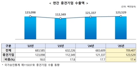 27ÀÏ Çѱ¹Áß°ß±â¾÷¿¬ÇÕȸ°¡ ¹ßÇ¥ÇÑ ‘2025³â Áß°ß±â¾÷ ¼öÃâ µ¿Çâ’¿¡ µû¸£¸é Áö³ÇØ Áß°ß±â¾÷ ÃÑ ¼öÃâ¾×Àº 1235¾ï3000¸¸ ´Þ·¯·Î Áý°èµÆ´Ù. Àü³â(1213¾ï ´Þ·¯)º¸´Ù 1.8% ´Ã¾î³ ±Ô¸ð·Î, 2³â ¿¬¼Ó Áõ°¡¼¼´Ù. ÀÌ´Â Áö³ÇØ ¿ì¸®³ª¶ó Àüü ¼öÃâ¾× 7093¾ï ´Þ·¯ÀÇ 17.4%¿¡ ÇØ´çÇÑ´Ù.