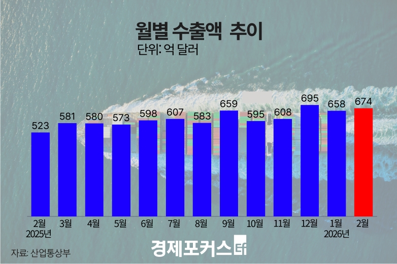 1ÀÏ »ê¾÷Åë»óºÎ°¡ ¹ßÇ¥ÇÑ ‘2026³â 2¿ù ¼öÃâÀÔ µ¿Çâ’¿¡ µû¸£¸é 2¿ù ¼öÃâÀº Àü³â µ¿¿ù ´ëºñ 29.0% Áõ°¡ÇÑ 674¾ï5000¸¸ ´Þ·¯·Î Áý°èµÆ´Ù. ¼³ ¿¬ÈÞ·Î Á¶¾÷Àϼö°¡ Àü³âº¸´Ù 3ÀÏ Àû¾úÀ½¿¡µµ Á¾Àü ÃÖ°íÄ¡¸¦ °æ½ÅÇß´Ù. Á¶¾÷Àϼö¸¦ °í·ÁÇÑ ÀÏÆò±Õ ¼öÃâÀº 49.3% ´Ã¾î³ 35¾ï5000¸¸ ´Þ·¯·Î, »ç»ó óÀ½À¸·Î 30¾ï ´Þ·¯¸¦ ³Ñ¾î¼¹´Ù. ¿ù°£ ¼öÃâÀº Áö³ÇØ 6¿ù ÀÌÈÄ 9°³¿ù ¿¬¼Ó Áõ°¡ È帧À» À̾´Ù.