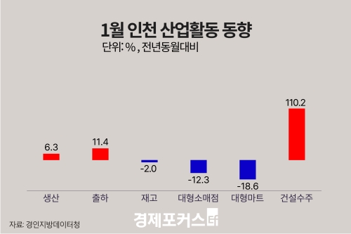 Áö³ 1¿ù ÀÎõÁö¿ª »ê¾÷Ȱµ¿Àº ±¤°ø¾÷ »ý»ê°ú ÃâÇϰ¡ Áõ°¡ÇÑ ¹Ý¸é ¼Òºñ´Â °¨¼ÒÇϰí, °Ç¼³¼öÁÖ´Â Å« ÆøÀ¸·Î ´Ã¾î³ °ÍÀ¸·Î ³ªÅ¸³µ´Ù.