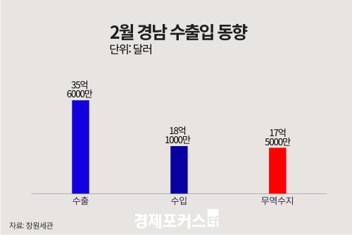 16ÀÏ Ã¢¿ø¼¼°üÀÌ ¹ßÇ¥ÇÑ ‘2026³â 2¿ù ¼öÃâÀÔ µ¿Çâ’¿¡ µû¸£¸é °æ³² ¼öÃâÀº 35¾ï6000¸¸ ´Þ·¯·Î Àü³â µ¿¿ù ´ëºñ 6.1% Áõ°¡Çß°í, ¼öÀÔÀº 18¾ï1000¸¸ ´Þ·¯·Î 2.2% °¨¼ÒÇß´Ù. ¹«¿ª¼öÁö´Â 17¾ï5000¸¸ ´Þ·¯ ÈæÀÚ¸¦ ±â·ÏÇß´Ù. ¼öÃâÀº Áö³ÇØ 11¿ù ÀÌÈÄ 3°³¿ù ¿¬¼Ó °¨¼Ò¿¡¼ ¹þ¾î³ª Áõ°¡·Î ÀüȯµÆÀ¸¸ç, ¼öÀÔÀº 2°³¿ù ¿¬¼Ó ÁÙ¾ú´Ù.