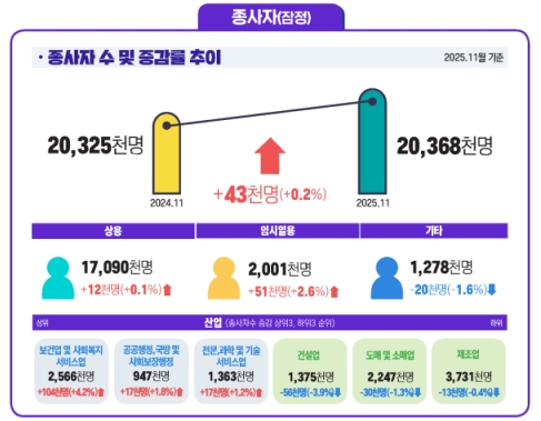 °í¿ë³ëµ¿ºÎ°¡ 30ÀÏ ¹ßÇ¥ÇÑ ‘2025³â 11¿ù »ç¾÷ü³ëµ¿·ÂÁ¶»ç °á°ú’¿¡ µû¸£¸é 11¿ù ¸¶Áö¸· ¿µ¾÷ÀÏ ±âÁØ Á¾»çÀÚ 1ÀÎ ÀÌ»ó »ç¾÷ü Á¾»çÀÚ ¼ö´Â 2036¸¸8000¸íÀ¸·Î Áý°èµÆ´Ù. ÀÌ´Â 1³â Àüº¸´Ù 4¸¸3000¸í(0.2%) Áõ°¡ÇÑ ¼öÄ¡´Ù. »ç¾÷ü Á¾»çÀÚ ¼ö´Â ¿ÃÇØ 1¿ù 5¸¸5000¸í °¨¼ÒÇÑ ÀÌÈÄ 8¿ù±îÁö °¨¼Ò È帧À» º¸ÀÌ´Ù°¡ 9¿ù ÀÌÈÄ Áõ°¡¼¼·Î ÀüÈ¯ÇØ ¼® ´Þ° À̾îÁö°í ÀÖ´Ù.