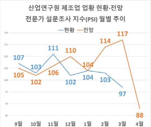 ÇâÈÄ Àü¸ÁÀº ´õ ¾îµÓ´Ù. 4¿ù Á¦Á¶¾÷ ¾÷Ȳ Àü¸Á PSI´Â 88·Î Àü¿ù Àü¸ÁÄ¡(117)º¸´Ù 29Æ÷ÀÎÆ®(p) ±Þ¶ôÇϸç 2025³â 5¿ù ÀÌÈÄ ÃÖÀú ¼öÁØÀ» ±â·ÏÇß´Ù. ³»¼ö´Â 98·Î 27p, ¼öÃâÀº 91·Î 39p °¢°¢ ¶³¾îÁú °ÍÀ¸·Î ¿¹»óµÆ´Ù. »ý»ê Àü¸Áµµ 97·Î 29p Ç϶ôÇß°í, ä»ê¼º Àü¸Á(88) ¿ª½Ã 24p ³·¾ÆÁö¸ç 7°³¿ù ¸¸¿¡ ±âÁØÄ¡¸¦ ¹Øµ¹¾Ò´Ù.