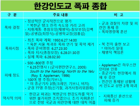 ±×·¯³ª ÇÙ½É ÀïÁ¡Àº ÆøÆÄ ½ÃÁ¡ÀÌ´Ù. 1950³â 6¿ù 28ÀÏ »õº® ±¹±º ÀϺΠºÎ´ë´Â ¾ÆÁ÷ ÇѰ ºÏÂÊ¿¡¼ ÀüÅõ ÁßÀ̾ú´Ù. ±º°ú °æÂûÀÌ ÅëÁ¦ÇÑ´Ù°í ÇßÁö¸¸, ¸¹Àº ÇǶõ¹Î°ú ±º Â÷·®ÀÌ ´Ù¸® À§¿¡ ¹ÐÁýµÅ ÀÖ¾ú´Ù. ±¹±ºÀº ¸¹Àº Àåºñ¸¦ ¹ö¸° ä ³ª·í¹è¸¦ ÀÌ¿ëÇØ ÇѰÀ» °Ç³Ê¾ß Çß´Ù. ±º»çÆíÂù¿¬±¸¼Ò ±â·Ï¿¡ ÀÇÇϸé, ´ç½Ã ÇѰ±³ ÆøÆÄ·Î 1300¿© ´ëÀÇ ±º Â÷·®ÀÌ À¯±âµÇ¾ú´Ù.