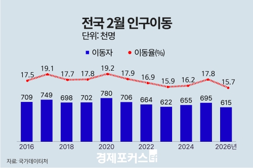 ÀÌ¿Í ÇÔ²² ¹ßÇ¥µÈ ‘2026³â 2¿ù ±¹³» Àα¸À̵¿ Åë°è’¿¡ µû¸£¸é Áö³´Þ À¾¸éµ¿ °æ°è¸¦ ³Ñ¾î °ÅÁÖÁö¸¦ ¿Å±ä À̵¿ÀÚ ¼ö´Â 61¸¸5000¸íÀ¸·Î Àü³â µ¿¿ù ´ëºñ 8¸¸¸í(11.5%) °¨¼ÒÇß´Ù.