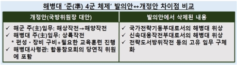 ‘4±º üÁ¦’´Â ±ºÀÇ Á¶Á÷ ±¸Á¶¸¦ ¹Ù²ã¾ß °¡´ÉÇÏ´Ù. ÇöÀç´Â À°·ÇØ·°ø±º 3°³ ±ºÁ¾(ÏÚðú)°ú ÇØ±º ¹Ø¿¡ ÇØº´´ë°¡ À־Ù. ±¹±ºÁ¶Á÷¹ý Á¦2Á¶ 1Ç׿£ “±¹±ºÀ» À°±º, ÇØ±º ¹× °ø±ºÀ¸·Î Á¶Á÷Çϸç, ÇØ±º¿¡ ÇØº´´ë¸¦ µÐ´Ù”°í µÇ¾îÀÖ°í, °°Àº ¹ý Á¦10Á¶ 3Ç×Àº “ÇØº´´ë¿¡ ÇØº´´ë»ç·É°üÀ» µÎ¸ç, ÇØº´´ë»ç·É°üÀº ÇØ±ºÂü¸ðÃÑÀåÀÇ ¸íÀ» ¹Þ¾Æ ÇØº´´ë¸¦ ÁöÈÖ·°¨µ¶ÇÑ´Ù”°í ¸í½ÃµÇ¾îÀÖ´Ù. µû¶ó¼ ±¹±ºÁ¶Á÷¹ýÀ» ¹Ù²ã¾ß Çϰí, ±ºÁ¾(ÏÚðú) °£ ÀÌÇØ°ü°è°¡ ¸Â¹°·Á ÀÖ´Ù.