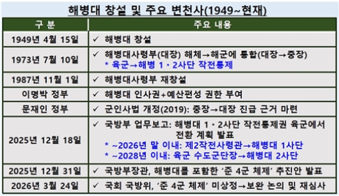 ÇØº´´ë´Â 1949³â â¼³µÇ¾î 1973³â±îÁö´Â À°·ÇØ·°ø±º°ú °°ÀÌ ±¹¹æºÎÀå°üÀÇ ÁöÈÖ·°ü¸®¸¦ ¹Þ¾ÒÀ¸³ª, 1973³â 10¿ù Àü°Ý ÇØÃ¼µÇ¸é¼ ÇØ±º Á¦2Âü¸ðÂ÷Àå(ÁßÀå)ÀÌ ÁöÈÖÇÏ°Ô µÆ´Ù. À̶§ºÎÅÍ ÇØº´´ë 1·2»ç´ÜÀÇ ÀÛÀüÅëÁ¦±ÇÀº À°±ºÀÌ Çà»çÇϰí ÀÖ´Ù.