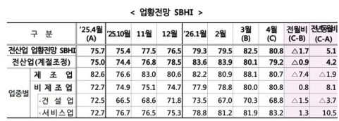 ¾÷Á¾º°·Î º¸¸é Á¦Á¶¾÷Àº 80.7·Î 7.4p Ç϶ôÇß°í, ºñÁ¦Á¶¾÷Àº 80.8·Î 0.8p »ó½ÂÇß´Ù. ºñÁ¦Á¶¾÷ °¡¿îµ¥ °Ç¼³¾÷Àº 68.8·Î 1.5p ³»·È°í, ¼ºñ½º¾÷Àº 83.2·Î 1.3p ¿Ã¶ú´Ù.