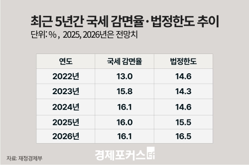 ¿ÃÇØ ±¹¼¼°¨¸éÀ² ¹ýÁ¤ Çѵµ´Â 16.5%·Î, Á¤ºÎ Àü¸ÁÄ¡(16.1%)º¸´Ù 0.4%p ³ô´Ù. Àü¸ÁÄ¡´ë·Î È®Á¤µÉ °æ¿ì 2023³â ÀÌÈÄ 3³â ¿¬¼Ó À̾îÁø ¹ýÁ¤ Çѵµ Ãʰú¿¡¼ ¹þ¾î³ª°Ô µÈ´Ù. ¹ýÁ¤ Çѵµ´Â Á÷Àü 3°³³âµµ ±¹¼¼°¨¸éÀ² Æò±Õ¿¡ 0.5%p¸¦ ´õÇØ »êÃâÇÑ´Ù.