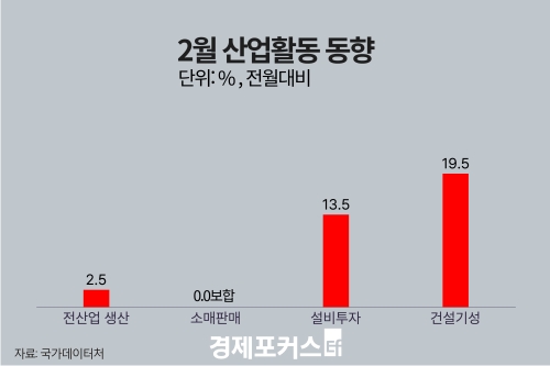 ±¹°¡µ¥ÀÌÅÍó°¡ 31ÀÏ ¹ßÇ¥ÇÑ ‘2¿ù »ê¾÷Ȱµ¿µ¿Çâ’¿¡ µû¸£¸é Àü»ê¾÷»ý»êÁö¼ö(°èÀýÁ¶Á¤·2020³â=100)´Â 118.4·Î Àü¿ù ´ëºñ 2.5% Áõ°¡Çß´Ù. ÀÌ´Â 2020³â 6¿ù(2.9%) ÀÌÈÄ 5³â 8°³¿ù ¸¸ÀÇ ÃÖ´ë Áõ°¡ ÆøÀÌ´Ù. »ê¾÷»ý»êÀº Áö³ÇØ 12¿ù 1.2% Áõ°¡Çß´Ù°¡ ¿ÃÇØ 1¿ù 0.9% °¨¼Ò·Î ÁÖÃãÇßÀ¸³ª 2¿ù µé¾î ¹ÝµîÇß´Ù.