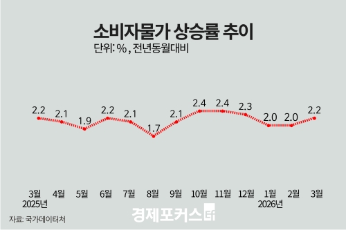 2ÀÏ ±¹°¡µ¥ÀÌÅÍó°¡ ¹ßÇ¥ÇÑ ‘2026³â 3¿ù ¼ÒºñÀÚ¹°°¡ µ¿Çâ’¿¡ µû¸£¸é 3¿ù ¼ÒºñÀÚ¹°°¡Áö¼ö´Â 118.80À¸·Î Àü³â µ¿¿ù ´ëºñ 2.2% ¿Ã¶ú´Ù. ¼ÒºñÀÚ¹°°¡»ó½Â·üÀº Áö³ÇØ 10¿ù 2.4%, 11¿ù 2.4%, 12¿ù 2.3%¸¦ ±â·ÏÇÑ µÚ ¿ÃÇØ µé¾î µÎ ´Þ ¿¬¼Ó 2.0%¸¦ À¯ÁöÇßÀ¸³ª, 2¿ù ¸» Áßµ¿ »çÅ ¿µÇâÀ¸·Î 3¿ù¿¡´Â 2.2%·Î È®´ëµÆ´Ù.