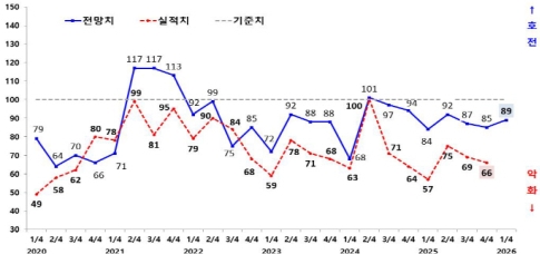 29ÀÏ ±¤ÁÖ»ó°øÈ¸ÀǼҿ¡ µû¸£¸é Áö¿ª Á¦Á¶¾÷ü 120°÷À» ´ë»óÀ¸·Î ½Ç½ÃÇÑ ‘2026³â 1ºÐ±â ±â¾÷°æ±â½Ç»çÁö¼ö(BSI)’ Á¶»ç °á°ú Áö¼ö´Â 89·Î Áý°èµÆ´Ù. Àü ºÐ±â(85)º¸´Ù 4Æ÷ÀÎÆ®(p) »ó½ÂÇßÁö¸¸ ±âÁØÄ¡ 100¿¡´Â ¹ÌÄ¡Áö ¸øÇß´Ù. BSI°¡ 100 ¹Ì¸¸ÀÌ¸é ´ÙÀ½ ºÐ±â¸¦ ºÎÁ¤ÀûÀ¸·Î º¸´Â ±â¾÷ÀÌ ´õ ¸¹´Ù´Â Àǹ̴Ù.