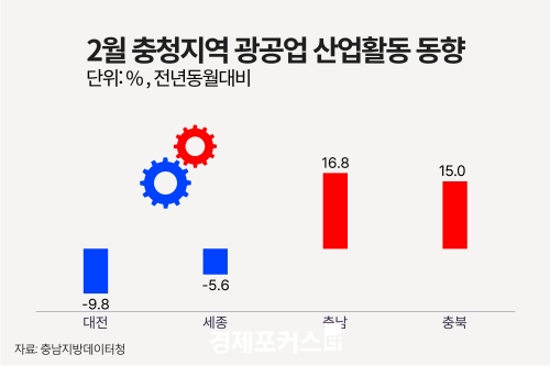 31ÀÏ ÃæÃ»Áö¹æÅë°èûÀÌ ¹ßÇ¥ÇÑ ‘2026³â 2¿ù ÃæÃ»Áö¿ª »ê¾÷Ȱµ¿µ¿Çâ’¿¡ µû¸£¸é ÃæºÏÀÇ ±¤°ø¾÷ »ý»êÀº Àü³â µ¿¿ù ´ëºñ 30.3% Áõ°¡ÇØ ÃæÃ»±Ç¿¡¼ °¡Àå ³ôÀº »ó½Â·üÀ» ±â·ÏÇß´Ù. Àü¿ù ´ëºñ·Îµµ 17.8% ´Ã¾ú´Ù. ÃâÇÏ´Â Àü³â µ¿¿ù ´ëºñ 22.4%, Àü¿ù ´ëºñ 17.2% °¢°¢ Áõ°¡Çß°í, Àç°í´Â Àü³â µ¿¿ù ´ëºñ 12.6%, Àü¿ù ´ëºñ 3.5% °¨¼ÒÇß´Ù.
