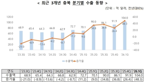 Çѱ¹¹«¿ªÇùȸ ÃæºÏÁö¿ªº»ºÎ°¡ ¹ßÇ¥ÇÑ ‘2026³â 1ºÐ±â ÃæºÏ ¼öÃâÀÔ µ¿Çâ’¿¡ µû¸£¸é 1ºÐ±â ¼öÃâÀº 103¾ï9698¸¸ ´Þ·¯·Î Àü³â µ¿±â ´ëºñ 48.3% Áõ°¡Çß´Ù. ÀÌ´Â Á¾Àü ÃÖ°íÄ¡¿´´ø Áö³ÇØ 4ºÐ±â(91¾ï9000¸¸ ´Þ·¯)¸¦ Å©°Ô ¿ôµµ´Â ¼öÄ¡´Ù. ÃÖ±Ù ºÐ±âº° Áõ°¡À²µµ Áö³ÇØ 2ºÐ±â 34.8%, 3ºÐ±â 36.8%, 4ºÐ±â 26.4%¿¡ ÀÌ¾î ¿ÃÇØ 1ºÐ±â 48.3%·Î È®´ëµÆ´Ù.