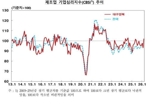 Çѱ¹ÀºÇà ´ë±¸°æºÏº»ºÎ°¡ ¹ßÇ¥ÇÑ ‘2026³â 3¿ù ±â¾÷°æ±âÁ¶»ç’¿¡ µû¸£¸é Á¦Á¶¾÷ ±â¾÷½É¸®Áö¼ö(CBSI)´Â 101.9·Î Àü¿ù ´ëºñ 8.7Æ÷ÀÎÆ®(p) »ó½ÂÇϸç ÇÑ ´Þ ¸¸¿¡ ¹ÝµîÇß´Ù. Àü±¹ Á¦Á¶¾÷ CBSI(97.1)°¡ Á¤Ã¼µÈ °Í°ú ºñ±³ÇÏ¸é °³¼± ÆøÀÌ ÄÇÀ¸¸ç, ±âÁØÄ¡ 100À» ¿ôµ¹¸ç ü°¨ °æ±â°¡ Àå±â Æò±Õ ¼öÁØÀ» ³Ñ¾î¼¹´Ù.