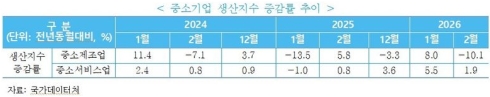 28ÀÏ Áß¼Òº¥Ã³±â¾÷¿¬±¸¿øÀÌ ¹ßÇ¥ÇÑ ‘KOSI Áß¼Ò±â¾÷ µ¿Çâ’¿¡ µû¸£¸é Áö³ 2¿ù Áß¼ÒÁ¦Á¶¾÷ »ý»êÀº ¸íÀý ¿¬ÈÞ¿¡ µû¸¥ Á¶¾÷Àϼö °¨¼Ò ¿µÇâÀ¸·Î Àü³â µ¿¿ù ´ëºñ 10.1% ÁÙ¾ú´Ù. ¹Ý¸é Áß¼Ò¼ºñ½º¾÷ »ý»êÀº µµ¼Ò¸Å¿Í Àü¹®·°úÇз±â¼ú ¼ºñ½º¾÷À» Áß½ÉÀ¸·Î 1.9% Áõ°¡Çß´Ù.
