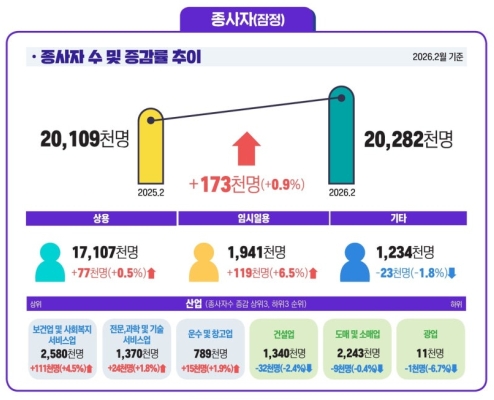 °í¿ë³ëµ¿ºÎ°¡ 31ÀÏ ¹ßÇ¥ÇÑ ‘2026³â 2¿ù »ç¾÷ü³ëµ¿·ÂÁ¶»ç °á°ú’¿¡ µû¸£¸é 2¿ù ¸» ±âÁØ Á¾»çÀÚ 1ÀÎ ÀÌ»ó »ç¾÷ü Á¾»çÀÚ ¼ö´Â 2028¸¸2000¸íÀ¸·Î Àü³â µ¿¿ù ´ëºñ 17¸¸3000¸í(0.9%) Áõ°¡Çß´Ù. »ç¾÷ü Á¾»çÀÚ ¼ö´Â Áö³ÇØ 9¿ù Áõ°¡ Àüȯ ÀÌÈÄ 6°³¿ù ¿¬¼Ó ¿À¸§¼¼¸¦ À̾´Ù.
