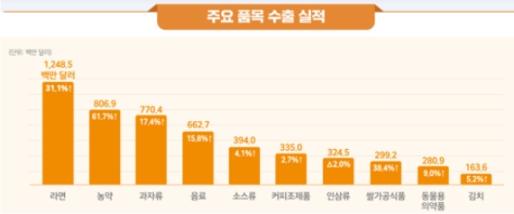¼¼ºÎ ǰ¸ñº°·Î º¸¸é ¶ó¸é, ³ó¾à, °úÀÚ·ù, À½·á, ¼Ò½º·ù, Ä¿ÇÇÁ¶Á¦Ç°, ½Ò°¡°ø½Äǰ, ±èÄ¡, ÆêǪµå, ¸®Å¥¸£, ´ß°í±â, ¾ÆÀ̽ºÅ©¸², À¯ÀÚ, Æ÷µµ µî 14°³ ǰ¸ñ ¼öÃâ¾×ÀÌ ÃÖ°íÄ¡¸¦ °æ½ÅÇß´Ù.