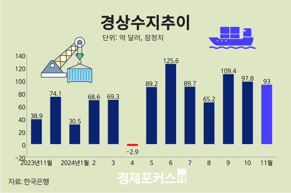 8ÀÏ Çѱ¹ÀºÇàÀÌ ¹ßÇ¥ÇÑ '2024³â 11¿ù ±¹Á¦¼öÁö(ÀáÁ¤)'¿¡ µû¸£¸é Áö³ÇØ 11¿ù °æ»ó¼öÁö´Â 93¾ï´Þ·¯·Î Áý°èµÆ´Ù. Áö³ÇØ 4¿ù ¿Ü±¹ÀÎ ¹è´ç Áõ°¡ µîÀ¸·Î 1³â ¸¸¿¡ ÀûÀÚ(-2¾ï9000¸¸´Þ·¯)¸¦ ±â·ÏÇÑ µÚ 5¿ùºÎÅÍ 7°³¿ù ¿¬¼Ó ÈæÀÚ´Ù.