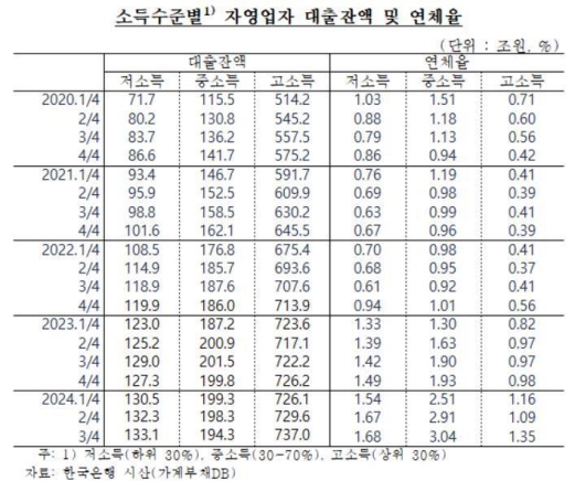 Áß¼Òµæ ÀÚ¿µ¾÷ÀÚµé ¿ª½Ã »óȲÀÌ ÁÁÁö ¾ÊÀº °ÍÀ¸·Î ³ªÅ¸³µ´Ù. Áö³ÇØ 3ºÐ±â ¸» Áß¼Òµæ ÀÚ¿µ¾÷ÀÚÀÇ ´ëÃâ ¿¬Ã¼À²Àº ¹«·Á 3.04%¸¦ ±â·ÏÇϸç, ÀÌ´Â °°Àº ½Ã±â °í¼Òµæ ¹× Àú¼Òµæ °èÃþº¸´Ù ´õ ³ôÀº ¼öÄ¡¸¦ ³ªÅ¸³Â´Ù. Çѱ¹ÀºÇàÀº “Áß¼Òµæ °èÃþ ³»¿¡¼µµ ƯÈ÷ Àú½Å¿ëÀÚ°¡ ´Ã¾î³ª¸é¼ ´Ù¸¥ ¼Òµæ ±¸°£º¸´Ù ´õ Å« Ãæ°ÝÀ» ¹Þ°í ÀÖ´Ù”°í ºÐ¼®Çß´Ù.