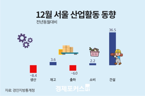 Áö³ÇØ 12¿ù ¼¿ï Áö¿ªÀÇ ±¤°ø¾÷ »ý»êÀÌ °¨¼ÒÇÑ °ÍÀ¸·Î ³ªÅ¸³µ´Ù. ¹Ý¸é ´ëÇü¼Ò¸ÅÁ¡ ÆÇ¸Å¾×°ú °Ç¼³¼öÁÖ¾×Àº Áõ°¡ÇÏ¸ç ¼Òºñ ¹× °Ç¼³°æ±â°¡ ´Ù¼Ò ȸº¹¼¼¸¦ º¸¿´´Ù.