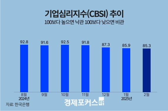 Çѱ¹ÀºÇàÀÌ 21ÀÏ ¹ßÇ¥ÇÑ ‘2025³â 2¿ù ±â¾÷°æ±âÁ¶»ç °á°ú’¿¡ µû¸£¸é, ÀÌ´Þ Àü »ê¾÷ ±â¾÷½É¸®Áö¼ö(CBSI)´Â 85.3À¸·Î Àü¿ùº¸´Ù 0.6Æ÷ÀÎÆ®(p) ³·¾ÆÁ³´Ù. CBSI´Â Áö³ÇØ 10¿ù 92.5¸¦ ±â·ÏÇÑ µÚ 11¿ù°ú 12¿ù, ¿ÃÇØ 1¿ù¿¡ À̾î 4°³¿ù ¿¬¼Ó Ç϶ô¼¼¸¦ À̾´Ù.