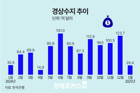 7ÀÏ Çѱ¹ÀºÇàÀÌ ¹ßÇ¥ÇÑ ‘2025³â 1¿ù ±¹Á¦¼öÁö(ÀáÁ¤)’¿¡ µû¸£¸é 1¿ù °æ»ó¼öÁö´Â Àü¿ù(123¾ï7000¸¸ ´Þ·¯) ´ëºñ 76% °¨¼ÒÇÑ 29¾ï4000¸¸ ´Þ·¯·Î Áý°èµÆ´Ù. ÀÌ´Â Àü³â µ¿¿ù(30¾ï5000¸¸´Þ·¯)°ú À¯»çÇÑ ¼öÁØÀÌ´Ù.