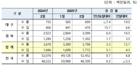 °æºÏ Áö¿ªÀº ¼öÃâÀÌ 6.0% Áõ°¡ÇÑ 31¾ï ´Þ·¯, ¼öÀÔÀÌ 1.7% Áõ°¡ÇÑ 13¾ï ´Þ·¯·Î ¹«¿ª¼öÁö ÈæÀÚ ±Ô¸ð´Â 18¾ï ´Þ·¯·Î Áý°èµÆ´Ù. °æºÏ¿¡¼´Â Àü±âÀüÀÚÁ¦Ç°(33.6%), ÀÚµ¿Â÷·ÀÚµ¿Â÷ ºÎǰ(6.2%)µîÀÇ ¼öÃâÀÌ Áõ°¡ÇÑ ¹Ý¸é, ±â°è·ù¿Í Á¤¹Ð±â±â(-26.5%), ȰøÇ°(-15.3%), ö°Á¦Ç°(-2.3%)µîÀÇ ¼öÃâÀº °¨¼ÒÇß´Ù.