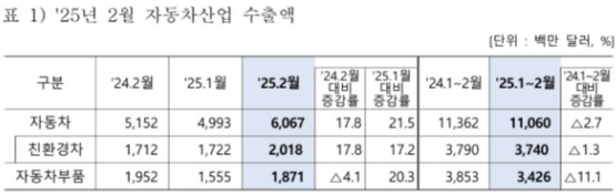»ê¾÷Åë»óÀÚ¿øºÎ°¡ ¹ßÇ¥ÇÑ ‘2025³â 2¿ù ÀÚµ¿Â÷ »ê¾÷ µ¿Çâ’¿¡ µû¸£¸é, Áö³´Þ ÀÚµ¿Â÷ ¼öÃâ¾×Àº Áö³ÇØ °°Àº ±â°£º¸´Ù 17.8% Áõ°¡ÇÑ 60¾ï7000¸¸ ´Þ·¯·Î Áý°èµÆ´Ù. ÀÌ´Â ¿ª´ë 2¿ù Áß °¡Àå ³ôÀº ¼öÃâ ½ÇÀûÀÌ´Ù. ¹°·® ±âÁØÀ¸·Îµµ 23¸¸ 2978´ë¸¦ ±â·ÏÇϸç Àü³â ´ëºñ 17.3% Áõ°¡Çß´Ù.