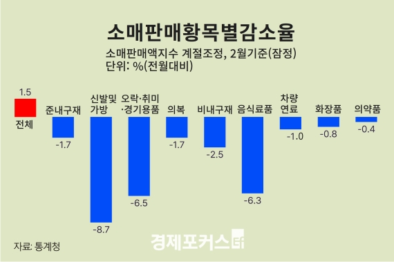 ¿ÃÇØ 2¿ù ±¹³» ¼Òºñ½É¸®°¡ ±Øµµ·Î À§ÃàµÇ¸é¼ ÀÇ·ù, ½Å¹ß, À½½Ä·áǰÀ» ºñ·ÔÇÑ 'ÀÛÀº ¼Òºñ'°¡ ´«¿¡ ¶ç°Ô °¨¼ÒÇÑ °ÍÀ¸·Î ³ªÅ¸³µ´Ù. ¿©±â¿¡ À¯³È÷ Ãß¿ü´ø ³¯¾¾¿Í Á¤Ä¡Àû ºÒ¾ÈÀÌ °ãÄ¡¸é¼ °ø¿¬ °ü¶÷, ¿Ü½Ä, ³ªµéÀÌ µî ¼ºñ½º¾÷ °ü·Ã ¼Òºñµµ Å« ÆøÀ¸·Î ÁÙ¾îµé¾ú´Ù.