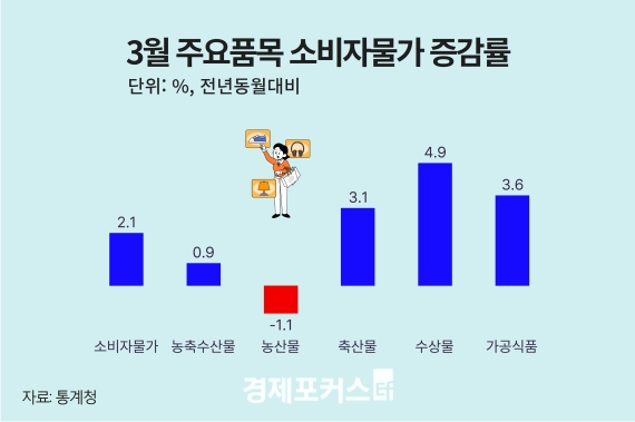 °¡°ø½Äǰ ¹°°¡´Â Å©°Ô ¿À¸£¸é¼ ¼ÒºñÀÚµéÀÇ ºÎ´ãÀ» Ű¿ü´Ù. °¡°ø½ÄǰÀº 1³â Àüº¸´Ù 3.6% ¿À¸£¸é¼ 2023³â 12¿ù(4.2%) ÀÌÈÄ 1³â 3°³¿ù ¸¸¿¡ Å« ÆøÀ¸·Î ¶Ù¾ú´Ù. ǰ¸ñº°·Î º¸¸é ÇÜ·º£ÀÌÄÁ(6.0%), »§(6.3%), Ä¿ÇÇ(8.3%), ±èÄ¡(15.3%) µîÀÌ ¿Ã¶ú´Ù.