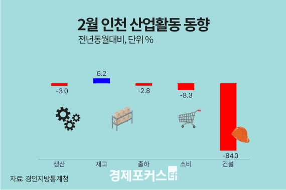 °æÀÎÁö¹æÅë°èûÀÌ ¹ßÇ¥ÇÑ ‘2¿ù ¼öµµ±Ç ½Ãµµº° »ê¾÷Ȱµ¿µ¿Çâ’¿¡ µû¸£¸é, ÀÎõÀÇ ±¤°ø¾÷ »ý»êÁö¼ö´Â 127.9(2020³â=100 ±âÁØ)·Î Àü³â µ¿¿ù ´ëºñ 3.0% °¨¼ÒÇß´Ù. ÃâÇÏÁö¼öµµ 109.3À¸·Î °°Àº ±â°£ 2.8% ÁÙ¾ú´Ù.