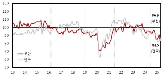 24ÀÏ Çѱ¹ÀºÇà ºÎ»êº»ºÎ°¡ ¹ßÇ¥ÇÑ ‘2025³â 4¿ù ºÎ»êÁö¿ª ±â¾÷°æ±âÁ¶»ç’¿¡ µû¸£¸é, ºñÁ¦Á¶¾÷ ±â¾÷½É¸®Áö¼ö(CBSI)´Â 86.9¸¦ ±â·ÏÇØ 3¿ùº¸´Ù 4.1Æ÷ÀÎÆ® Ç϶ôÇϸç Àå±â Æò±ÕÄ¡(100)¸¦ Å©°Ô ¹Øµ¹¾Ò´Ù. ƯÈ÷ 5¿ù Àü¸ÁÄ¡´Â 85.8·Î, ÀÌ´Þº¸´Ù 1.9Æ÷ÀÎÆ® ´õ ¶³¾îÁú °ÍÀ¸·Î ¿¹ÃøµÆ´Ù. CBSI´Â 100À» ±âÁØÀ¸·Î ±× ÀÌ»óÀÌ¸é °æ±â°¡ ³«°üÀû, ¹Ì¸¸ÀÌ¸é ºñ°üÀûÀ¸·Î Æò°¡µÊÀ» ¶æÇÑ´Ù.