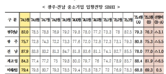 29ÀÏ Áß¼Ò±â¾÷Áß¾Óȸ ±¤ÁÖÀü³²Áö¿ªº»ºÎ°¡ ¹ßÇ¥ÇÑ '5¿ù Áß¼Ò±â¾÷ °æ±âÀü¸ÁÁ¶»ç'¿¡ µû¸£¸é, ÀÌ Áö¿ª Áß¼Ò±â¾÷ ¾÷ȲÀü¸ÁÁö¼ö(SBHI)´Â 76.2·Î ³ªÅ¸³µ´Ù. ÀÌ´Â Áö³´Þ(79.3)º¸´Ù 3.1Æ÷ÀÎÆ®, Áö³ÇØ °°Àº ´Þ(82.0)º¸´Ù´Â 5.8Æ÷ÀÎÆ® ³·Àº ¼öÄ¡´Ù. Àü±¹ Æò±Õ(75.7)º¸´Ù´Â ¼ÒÆø ³ôÁö¸¸, ¿©ÀüÈ÷ °æ±â ºÎÁø ±¹¸éÀ» ¹þ¾î³ªÁö ¸øÇϰí ÀÖ´Ù.
