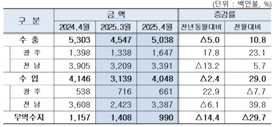 15ÀÏ ±¤ÁÖº»ºÎ¼¼°üÀÌ ¹ßÇ¥ÇÑ ‘4¿ù ¼öÃâÀÔ µ¿Çâ’¿¡ µû¸£¸é, ±¤ÁÖ·Àü³² Àüü ¼öÃâÀº Àü³â µ¿¿ù ´ëºñ 5.0% °¨¼ÒÇÑ 50¾ï3800¸¸ ´Þ·¯, ¼öÀÔÀº 2.4% °¨¼ÒÇÑ 40¾ï4800¸¸ ´Þ·¯¸¦ ±â·ÏÇß´Ù. ÀÌ·Î½á ¹«¿ª¼öÁö´Â 9¾ï9000¸¸ ´Þ·¯ ÈæÀÚ·Î Áý°èµÆ´Ù. ÀÌ´Â Áö³ÇØ °°Àº ´Þ(11¾ï5700¸¸ ´Þ·¯)º¸´Ù 14.4%, Àü¿ù(14¾ï800¸¸ ´Þ·¯) ´ëºñ 29.7% °¨¼ÒÇÑ ¼öÄ¡´Ù.