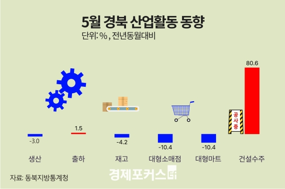Áö³­ 5¿ù ´ë±¸¿Í °æºÏ Áö¿ªÀÇ ±¤°ø¾÷ »ý»ê°ú ´ëÇü¼Ò¸ÅÁ¡ ÆÇ¸Å´Â ¸ðµÎ °¨¼Ò¼¼¸¦ º¸ÀÎ °¡¿îµ¥, °Ç¼³¼öÁÖ´Â ´ë±¸´Â ±Þ°¨ÇÑ ¹Ý¸é °æºÏÀº Å« ÆøÀÇ Áõ°¡¸¦ ±â·ÏÇÏ¸ç ´ëÁ¶ÀûÀÎ È帧À» ³ªÅ¸³Â´Ù.