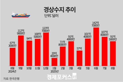 Çѱ¹ÀºÇàÀÌ 2ÀÏ ¹ßÇ¥ÇÑ ‘2025³â 8¿ù ±¹Á¦¼öÁö(ÀáÁ¤)’¿¡ µû¸£¸é, °æ»ó¼öÁö´Â 91¾ï5000¸¸ ´Þ·¯(¾à 12Á¶8000¾ï¿ø) ÈæÀÚ¸¦ ±â·ÏÇß´Ù. ÀÌ´Â Àü¿ù(107¾ï8000¸¸ ´Þ·¯)º¸´Ù 16¾ï3000¸¸ ´Þ·¯ ÁÙ¾úÁö¸¸, 8¿ù ±âÁØÀ¸·Î´Â ¿ª´ë ÃÖ´ë ±Ô¸ð´Ù. ÀÌ·Î½á °æ»ó¼öÁö´Â 2000³â´ë µé¾î µÎ ¹øÂ°·Î ±ä 28°³¿ù ¿¬¼Ó ÈæÀÚ ±â·ÏÀ» À̾´Ù.