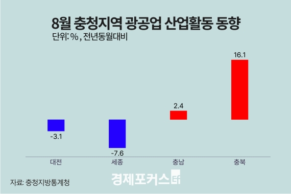 30ÀÏ Åë°èûÀÌ ¹ßÇ¥ÇÑ ‘2025³â 8¿ù ÃæÃ»Áö¿ª »ê¾÷Ȱµ¿µ¿Çâ’¿¡ µû¸£¸é ÃæºÏÀÇ ±¤°ø¾÷ »ý»êÁö¼ö´Â Àü³âµ¿¿ù´ëºñ 16.1% »ó½ÂÇÏ¸ç ¶Ñ·ÇÇÑ È¸º¹¼¼¸¦ º¸¿´´Ù. Ãæ³²µµ 2.4% Áõ°¡ÇØ Àü¿ù¿¡ ÀÌ¾î ¿Ï¸¸ÇÑ »ó½Â¼¼¸¦ À¯ÁöÇß´Ù. ¹Ý¸é ´ëÀü(-3.1%)°ú ¼¼Á¾(-7.6%)Àº Ç϶ô¼¼¸¦ ¹þ¾î³ªÁö ¸øÇß´Ù.