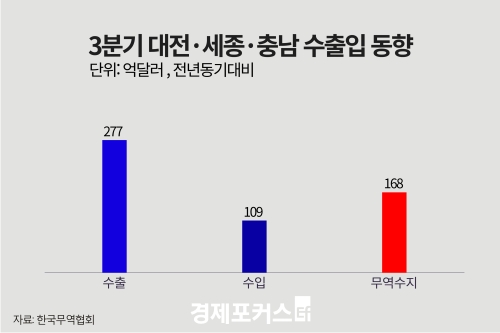 ¿ÃÇØ 3ºÐ±â ´ëÀü·¼¼Á¾·Ãæ³²Áö¿ª ¼öÃâÀÌ 277¾ï ´Þ·¯·Î Áö³ÇØ °°Àº ±â°£º¸´Ù 7.3% Áõ°¡ÇÏ¸ç ¿ÃÇØ ºÐ±â ±âÁØ ÃÖ°íÄ¡¸¦ ±â·ÏÇß´Ù. ¼öÀÔÀº 10.6% °¨¼ÒÇÑ 109¾ï ´Þ·¯·Î, ¹«¿ª¼öÁö´Â 168¾ï ´Þ·¯ ÈæÀÚ¸¦ ³ªÅ¸³Â´Ù.