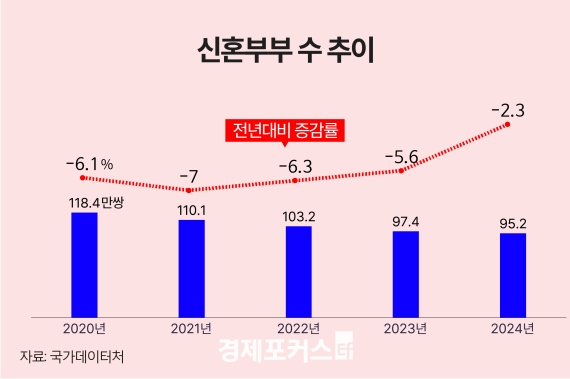 ±¹°¡µ¥ÀÌÅÍó°¡ 12ÀÏ ¹ßÇ¥ÇÑ ‘2024³â ½ÅÈ¥ºÎºÎ Åë°è °á°ú’¿¡ µû¸£¸é Áö³ÇØ ½ÅÈ¥ºÎºÎ´Â 95¸¸2000½ÖÀ¸·Î Àü³â(97¸¸4000½Ö)º¸´Ù 2¸¸2000½Ö(2.3%) ÁÙ¾ú´Ù. ½ÅÈ¥ºÎºÎ Åë°è´Â ¸Å³â 11¿ù 1ÀÏ ±âÁØ È¥ÀÎ ½Å°í ÈÄ 5³âÀÌ Áö³ªÁö ¾ÊÀº ºÎºÎ °¡¿îµ¥ ºÎºÎ Áß ÃÖ¼Ò 1¸íÀÌ ±¹³» °ÅÁÖÇÏ´Â °æ¿ì¸¦ ´ë»óÀ¸·Î ÇÑ´Ù. ¿¬°£ ½ÅÈ¥ºÎºÎ ¼ö´Â 2015³â Åë°è ÀÛ¼º ÀÌÈÄ ÁÙ°ð 100¸¸½ÖÀ» ³Ñ¾úÁö¸¸ 2023³âºÎÅÍ 100¸¸½Ö ¾Æ·¡·Î ¶³¾îÁ³´Ù.