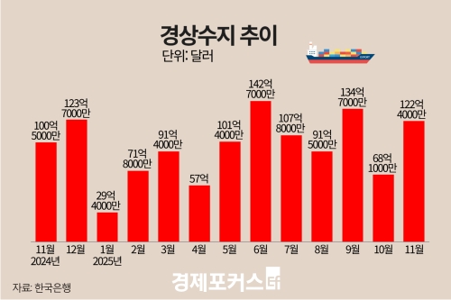 Çѱ¹ÀºÇàÀÌ 9ÀÏ ¹ßÇ¥ÇÑ ‘±¹Á¦¼öÁö(ÀáÁ¤)’¿¡ µû¸£¸é Áö³ÇØ 11¿ù °æ»ó¼öÁö´Â 122¾ï4000¸¸ ´Þ·¯ ÈæÀÚ·Î Áý°èµÆ´Ù. ÀÌ´Â Àü¿ù(68¾ï1000¸¸ ´Þ·¯) ´ëºñ 1.8¹è ¼öÁØÀ¸·Î ´Ã¾î³ °ÍÀ¸·Î, 11¿ù ±âÁØ ¿ª´ë ÃÖ´ë ÈæÀÚ´Ù. °æ»ó¼öÁö´Â À̷νá 31°³¿ù ¿¬¼Ó ÈæÀÚ È帧À» À̾´Ù.