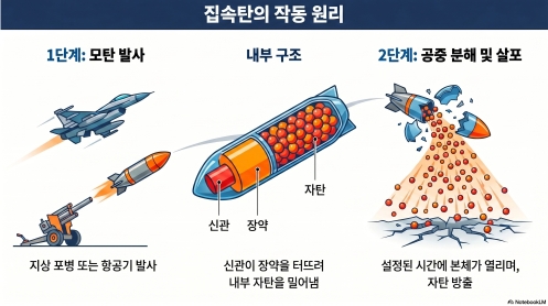 ‘집속탄(集束彈·Cluster Munitions=모자탄 또는 확산탄)’은 ‘하나의 폭탄(母彈) 안에 수십~수백 개의 소형폭탄(子彈)이 들어있는 형태로서 모탄이 고고도에서 터지면서 자탄이 사방으로 흩뿌려져 넓은 지역에 피해를 주는 무기체계’다. 다수의 목표물을 동시다발·무차별적으로 공격해 주변을 동시에, 한꺼번에 폭격할 수 있기에 ‘악마의 무기’로 불린다.